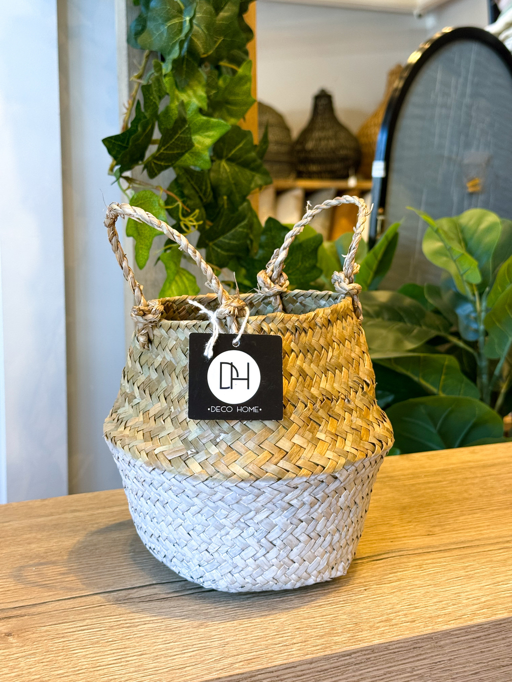 - Cesto de fibras naturales color beige con la parte inferior pintada en negro